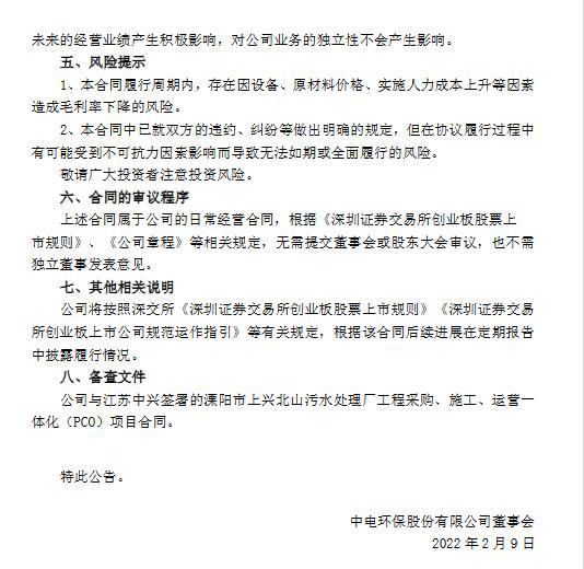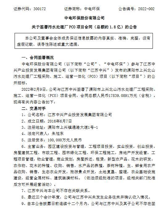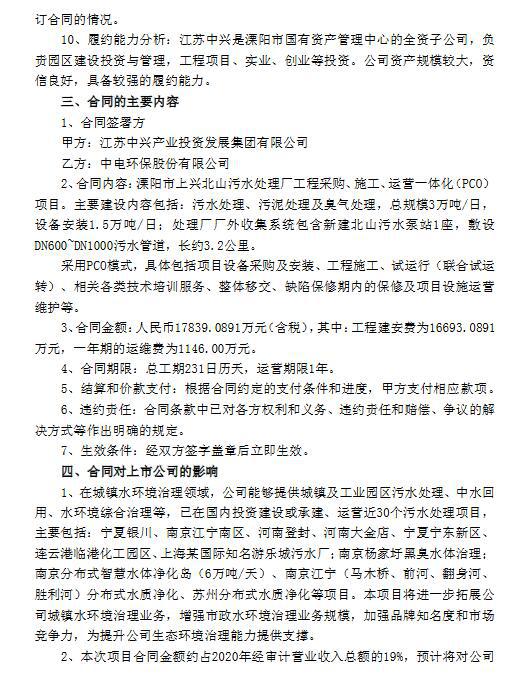 2022年2月9日,公司與江蘇中興簽署了溧陽(yáng)市上興北山污水處理廠工程采購(gòu)、施工、運(yùn)營(yíng)一體化(PCO)項(xiàng)目合同,合同總額人民幣約1.78億元(含稅)。